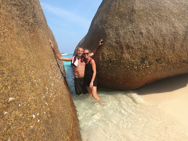Now, it's worth noting that I had quite a bit of anxiety going into this trip. After all, I had never been away from the kids for 9 days and I had certainly never been on the other side of the world from them! To add to that, we had no way of communicating with home for the duration of our trip. All of this led to some rough times for this Mom during our trip. I had a very difficult time diving - something I've NEVER struggled with before. But a panic attack at 90 feet on our first dive really messed with my head for the remainder of the dives. There were lots of tears - we'll just leave it at that! But thanks to our dive guide, James, I was able to reclaim my spot in our dive group after missing out on seeing a giant blue whale on the one and only night dive. Talk about FOMO! James worked with me calmly and patiently every day to make sure I didn't miss anything else. Thanks to James, I was able to see our other bucket list item - MANTA RAYS! Another unbelievably humbling experience. Nick and Lindsay had seen them before and I was always in awe when I'd watch their GoPro footage. And here we were, right alongside them, swimming with Manta after Manta after Manta! I have no idea how many we saw over the course of our trip. Too may to count! They are not common that time of year but because of the plankton in the water, they had come to feed. The plankton made for pretty poor visibility for all of our dives, but it was SO worth it for the Mantas. We even swam with one while snorkeling! In general, the sea life in the Andaman Sea is so different than any diving we had done before. Endless varieties of fish and coral, and the most beautiful star fish you can imagine. Even with poor visibility it was the best diving of our lives.